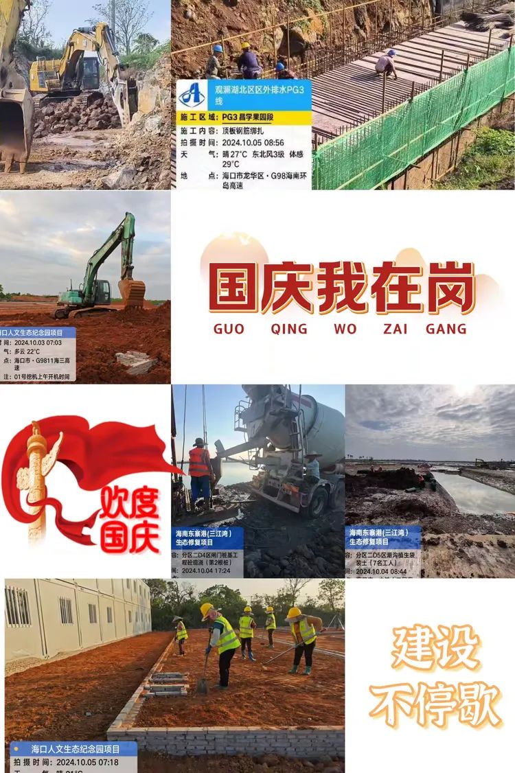 为积极贯彻落实市委市政府的工作部署,公司负责建设的海口市人文生态纪念园项目、海南东寨港(三江湾)生态修复项目、观澜湖北区区外排水工程(PG3线)等项目,国庆期间管理人员及施工人员始终坚守岗位,加快项目复工复产,确保项目进度、安全与质量同步推进。
