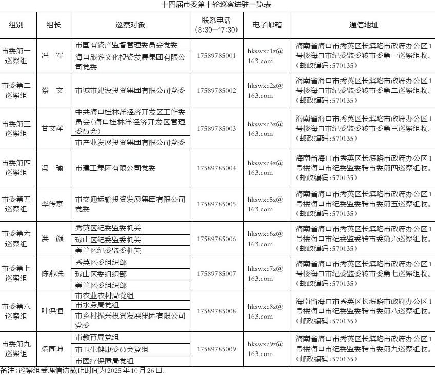 据悉,本轮巡察为期2个半月左右。巡察期间设置专门的联系电话、电子邮箱等,并开通海口“码上巡”网上举报平台,广大干部群众可以通过来信、来电、来访或者通过“清廉海口”及“海口12345”微信公众号的“巡察举报”端口,用手机扫描海口“码上巡”信访举报二维码,向巡察组反映问题。巡察组主要受理反映被巡察党组织领导班子及其成员、下一级党组织主要负责人和重点岗位人员问题的来信来电来访,重点是关于违反政治纪律、组织纪律、廉洁纪律、群众纪律、工作纪律和生活纪律等方面的举报和反映。其他不属于巡察受理范围的信访问题,请按照有关规定到当地信访或有关部门投诉举报。欢迎广大干部群众反映问题、提供线索,巡察组受理信访截止时间为2025年10月26日。